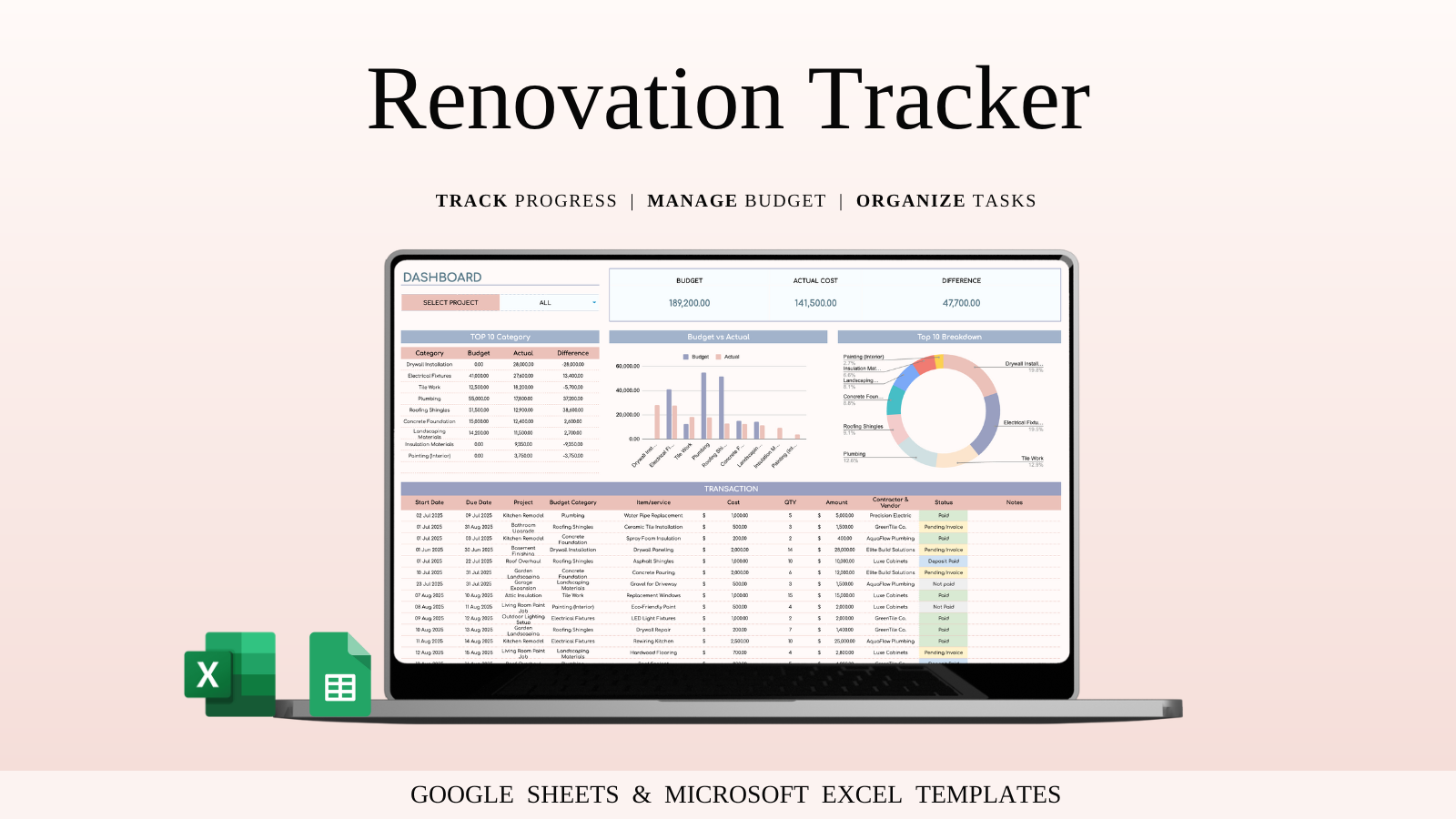 Home Renovation Tracker Spreadsheet Template offers a complete and user-friendly solution for organizing and managing renovation projects. Designed for use in both Google Sheets and Excel, it’s ideal for homeowners, contractors, or project managers who want to stay on schedule, maintain budgets, and keep their renovation process streamlined from start to finish.