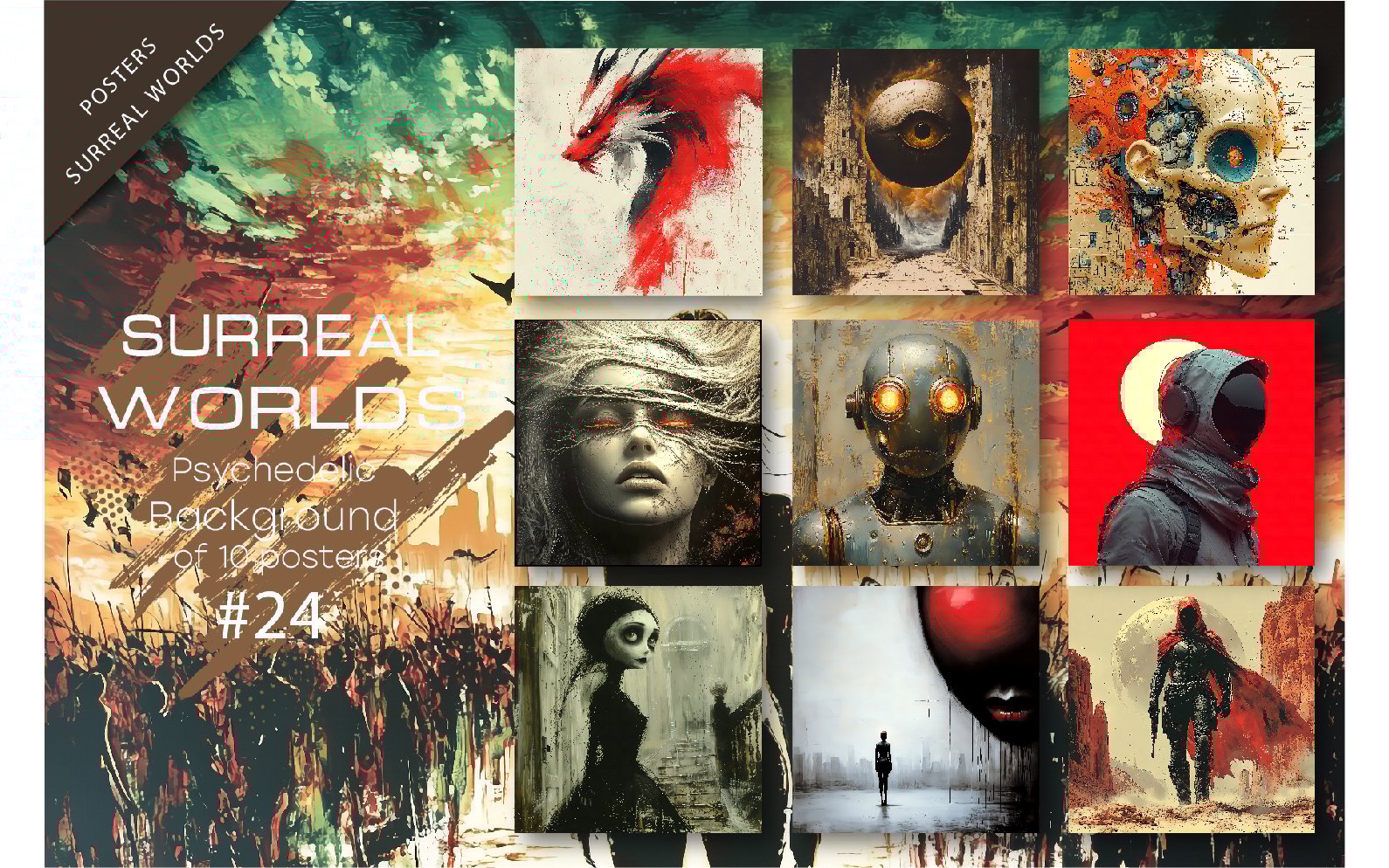 جهان های سورئال 24. مجموعه ای از پوسترها با مناظر خارق العاده، شخصیت های عرفانی و موارد دیگر در مجموعه.