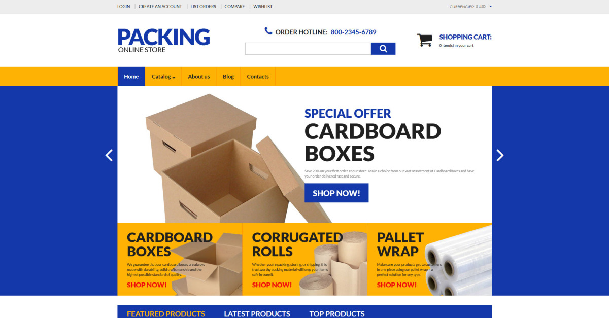 Build a user-friendly store of packing items with this responsive VirtueMart template. It features a dropdown shopping cart powered by Ajax. This advanced web technology enables buyers to add each product to the cart without page reloading. They can also sort items by multiple criteria including a creation date, product price, sale, and manufacturer. For a more comfortable experience, this packaging VirtueMart template has a sticky menu. It gives customers a constant access to your product categories and the main store pages. With a newsletter form popup, your subscriber base will grow. When it comes to customization, you can edit the default color scheme with one click only. A front-end customizer gives such an opportunity.