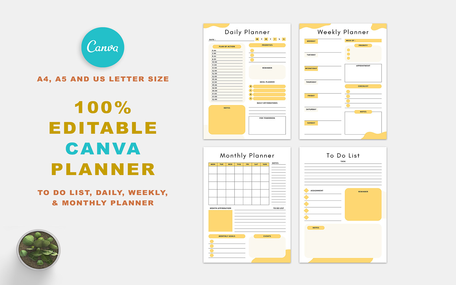 This Editable The TO DO LIST & DAILY, WEEKLY, MONTHLY has everything you need to get started!Choose from Canva template pages to quickly and easily create your planner.You can add your own personal touch by changing the colors, fonts, layouts, images,and backgrounds. Everything is customizable with Canva’s simple drag and drop interface.When you download you will get a printable pdf doc and one PDF Instructions file for customization CANVA template.